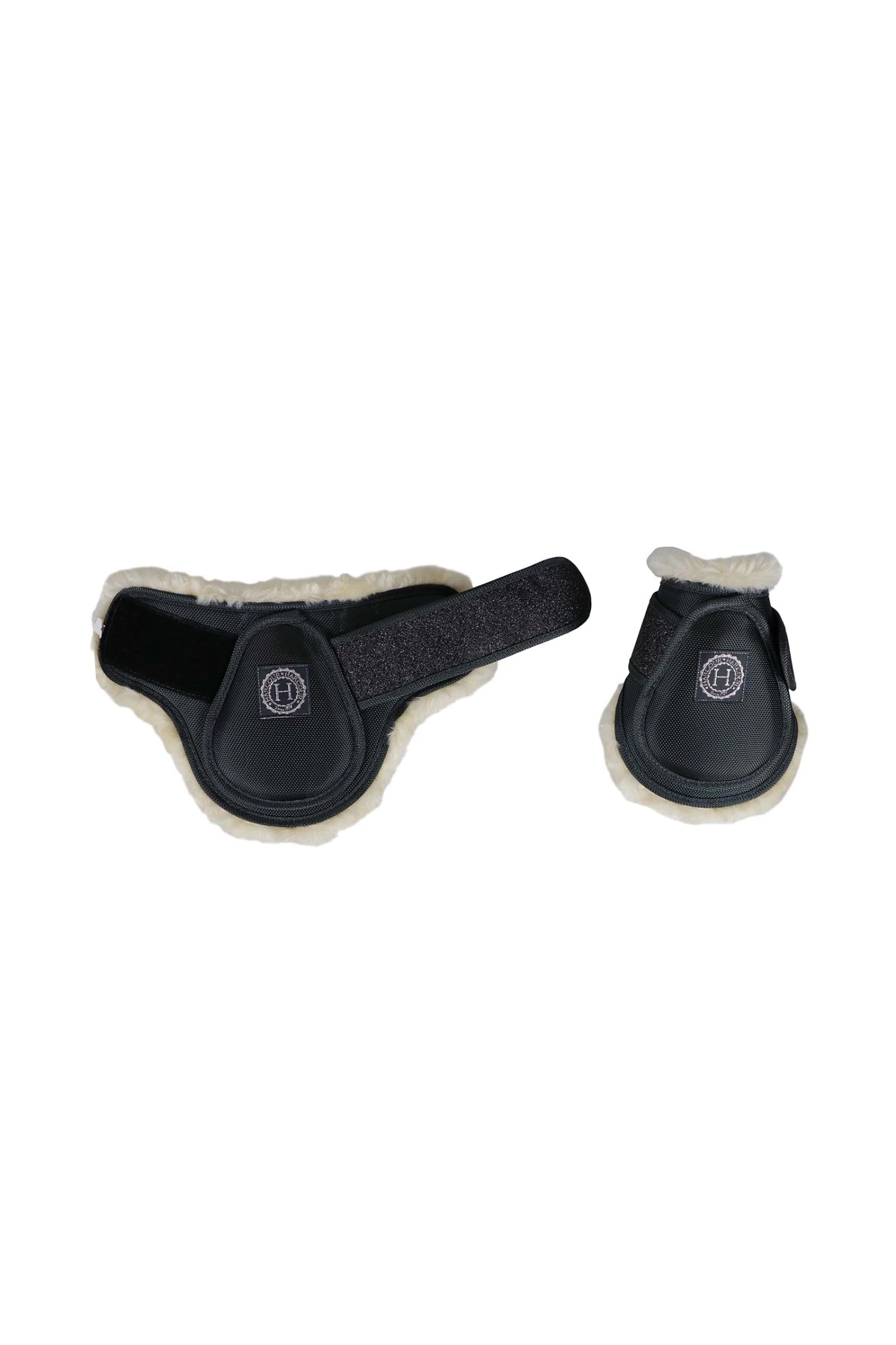 2er-Set Streichkappen, die Komfort, Atmungsaktivität und Schutz bieten. Lammfellimitat zum Wohle der Tiere. 1600 Denier Außenmaterial und Klettverschluss. Glitzernder HARCOUR-Aufnäher. M Cob L Vollblut XL Warmblut