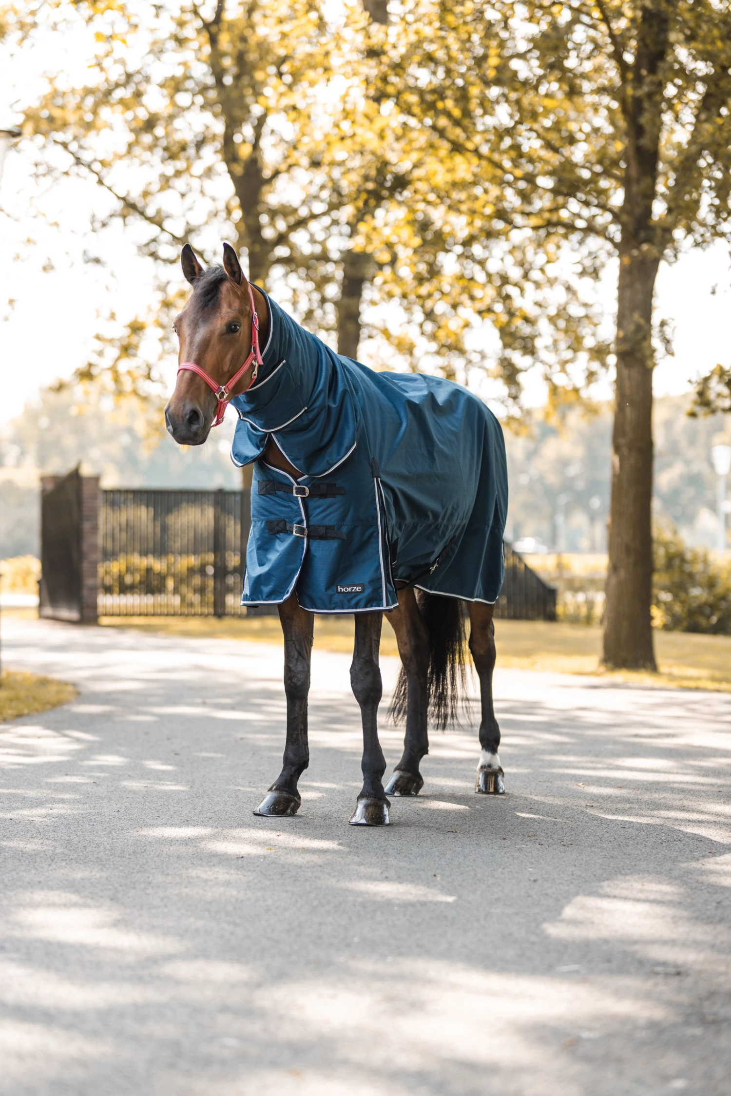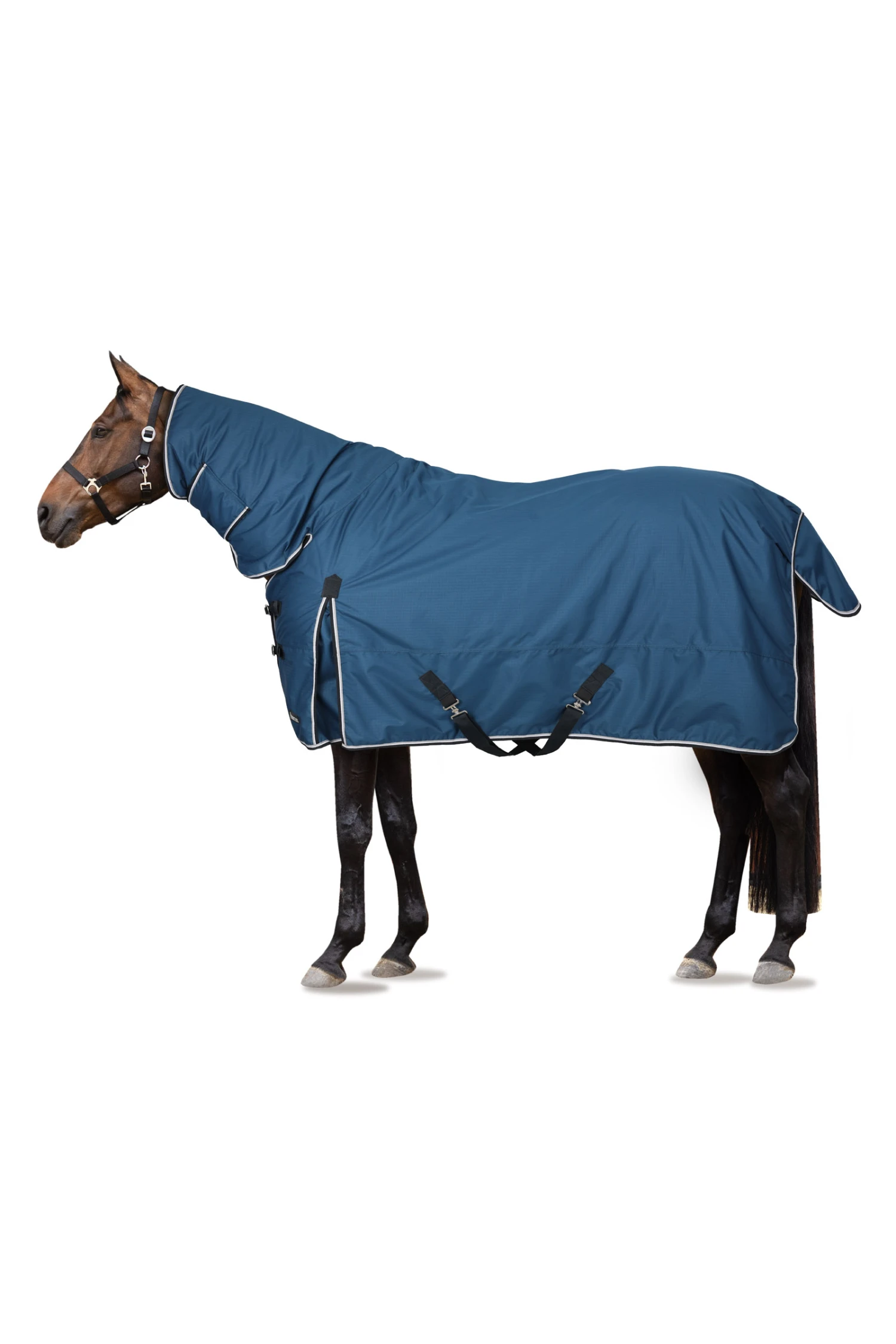 Diese Decke mit Halsteil ist aus wasserdichtem, atmungsaktivem Material gefertigt. Der gute Sitz an Hals und Schultern macht sie bequem und die hohen Gehfalten bieten Bewegungsfreiheit, damit sich dein Pferd austoben kann und nicht eingeschränkt wird. Frontverschlüsse, Kreuzgurte und Beinschnüre halten die Decke sicher an ihrem Platz und verhindern Verrutschen.